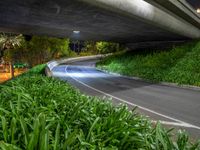 the light shines off in the tunnel of a bridge over the road with plants on either side