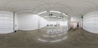 A 360-degree fisheye view of the interior of a high-rise building in Los Angeles. The open space is filled with natural light, highlighting the white walls and vaulted ceilings. The modern architecture and clean design make it a perfect space for a photo studio or creative workspace.