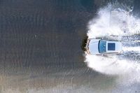 This is an aerial view of a suburban neighborhood in Los Angeles, California, USA. The landscape showcases open spaces, roads, and residential areas surrounded by trees. In the distance, a river can be seen flowing and a lake glistens under the blue sky. The freezing temperatures have created a shimmering, icy effect on the water's surface. The image captures the automotive design and exterior of vehicles parked in driveways. This scene represents a serene and peaceful suburban setting in Los Angeles.