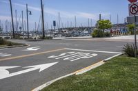A low angle view of a road in Los Angeles, California. The clear sky contrasts with the asphalt road surface and the surrounding residential area. The road leads to a pier and harbor, with a jetty and crosswalk visible.