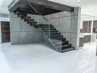 A modern home in Los Angeles, California showcasing stunning architecture and interior design. The spacious interior features a grand staircase with sleek handrails and stylish flooring. The concrete surfaces add a touch of industrial charm to the elegant villa.
