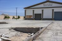 A daytime view of an industrial area in Los Angeles, California. The foreground features a loading dock and warehouse, while road surfaces are lined with warehouses and factories. The architecture includes residential properties and commercial buildings.
