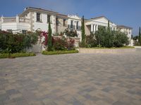 A stunning view of a classic mansion in the residential area of Los Angeles. Cobblestone driveway leads to a grand entry with a beautifully landscaped courtyard. Clear skies and sunshine create a picturesque backdrop.