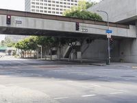 A view of a modern cityscape in Los Angeles, California. The architecture features a mix of buildings, bridges, and underpasses. The city streets are lined with trees and vegetation, while vehicles navigate the urban infrastructure.