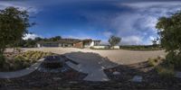a house and a yard with trees in the background of this photo, taken through an old spherical mirror