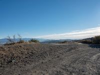 A rugged off-road track in the natural landscape of Los Angeles, California. Clear skies and contrails create a picturesque scene. The sandy and gravel terrain adds to the recreational appeal of this rural mountain road.
