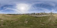 a panorama of the grass and hills is shown in this 360 - fish eye photograph