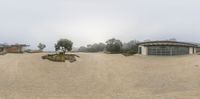 the image has a blurry view of a house with trees in front of it