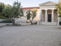 A classic suburban villa in Los Angeles, California. The clear sky highlights the stunning facade of this residential property. The tree-lined driveway and well-maintained road surface adds to the charm. A perfect day to explore the architectural wonders of LA.