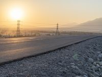 this is a picture of the sun setting over the desert and power lines on the road