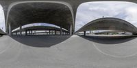 several different views of a car park with a road passing under it and people on bikes and cars
