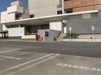 parking spaces outside of an office complex where a car is parked and a person standing on a sidewalk in front of it