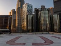A stunning view of the Los Angeles cityscape at dawn. Futuristic architecture dominates the business district, with sleek office buildings and a helipad on the rooftop. The open space and concrete surfaces add to the modern urban design.