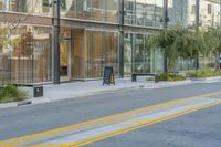 A vibrant city scene in Los Angeles, California. Modern architecture and glass walls create a dynamic urban landscape. Empty sidewalks lead to a busy storefront, reflecting the city's active lifestyle and urban design.