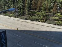 This stock photo features a view of a road in Los Angeles, California, USA. The road is made of asphalt and surrounded by grass, trees, and buildings. It is a bright sunny day with clear blue skies. The high line and composite material of the road surface create a smooth and durable road. The image captures the urban design and public space of the city, with land lots and vegetation adding to the overall look. The photo showcases the urban landscape with a slight slope and hard shadows.