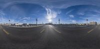 a view from a fish eye lens shows a city street and sky in the background