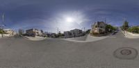 An asphalt road stretches through a suburban residential area in Los Angeles. Clear skies complement the open space of this Californian cityscape, showcasing urban life on a clear day.