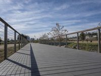 This image captures the iconic Los Angeles skyline during a clear sky day in California, USA. The cityscape showcases a combination of modern skyscrapers, architecture, and nature. The foreground features a walkway with an iron guard rail, lined with trees and wood floor. The walkway leads to a bridge over a river, offering a recreational path for visitors to explore the park. The vibrant spring foliage and clear sky create a picturesque view of the city. This photo represents the harmony between urban development and natural beauty in Los Angeles.