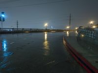 A nighttime view of the Los Angeles cityscape, with the iconic skyscrapers reflected in the wet road. The grey sky adds to the gloomy atmosphere, while street lights and traffic lights illuminate the dark streets.