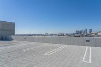 a large parking lot on top of a building in front of tall buildings with a clear blue sky