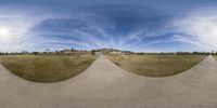 two fisheyes show the reflection of some buildings in this panorama lens photograph of a skateboarder at a park