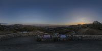 the sun sets behind a city with hills in the background and signs to use as a seating area for people to sit
