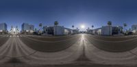 a street view of buildings and palm trees at sunset or sunrise, from a fish - eye lens