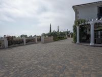 Classic architecture in Los Angeles, California, with a large brick patio and a private residence surrounded by a garden and fountain area. The mansion shines under the sunshine, contrasting the gloomy grey sky.