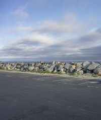 a parking lot filled with lots of rocks and rocks walling it around the sidewalk
