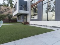 A contemporary residence in Los Angeles, California. The modern architecture features a green lawn and wooden stairs leading to the front door. Large windows provide ample natural light and a view of the courtyard and garden. A perfect home in a residential area.