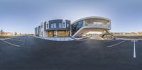 the house has a curved exterior with a curved entrance and curved facade on top of a building
