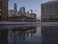 A stunning cityscape of Los Angeles at dawn, with the iconic California skyline reflected in the wet pavement. Modern skyscrapers and classic architecture complement the open spaces and park areas of this urban metropolitan area.