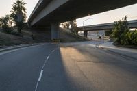 This image captures the city of Los Angeles at dawn in the state of California, USA. The clear sky provides a stunning backdrop to the urban landscape. The photo showcases a straight road lined with infrastructure, including bridges and underpasses. A truck can be seen driving underneath an overpass, with a yellow traffic signal on the road. The image represents the bustling city life and urban design of Los Angeles. This is a typical scene of the break of day in California.