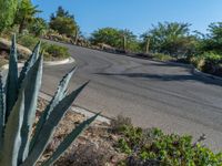 Curved road in the desert of California, with a large cactus plant in the foreground. The road leads to the majestic mountains of Los Angeles. A quintessential day in sunny California.