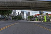 A view of downtown Los Angeles from above, showcasing the city's impressive architecture and bustling city life. The straight road below blurrs with motion as vehicles navigate the busy urban thoroughfare.