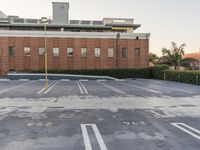 an empty parking lot with no one riding in it and building to the right of it
