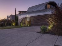 A low-light image capturing the stunning modern architecture of a residential building in Los Angeles. The facade of the house features a unique design, with artistic walkways and shaded entryways. The futuristic architecture adds to the charm of city life in Los Angeles.