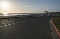 A picturesque sunrise in Los Angeles, California. The sun casts a golden glow on the low coastal shore. Palm trees line the road, leading to the sandy beach. The clear blue ocean and sky create a serene atmosphere.