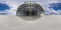 this is an image of a hangar under a cloudy sky with clouds, and one side in a circular mirror