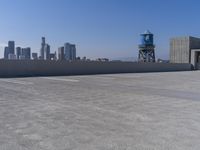 A modern high-rise condominium in Los Angeles, California. The urban design features a clear sky, with a composite material parking deck leading to the building. The cityscape showcases the city's architecture and skyscrapers.