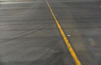 A high view of an elevated road surface in Los Angeles, California. Yellow lane lines guide traffic on the busy road. The asphalt flooring contrasts with the clear blue sky. A bustling infrastructure at an airport or airfield.