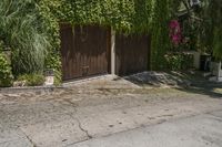 A classic residential property in the Hollywood Hills neighborhood of Los Angeles. Surrounded by lush vegetation, the house stands tall against the clear blue sky. The tree-lined driveway leads up to the grand entryway, with a concrete street and parking garage nearby.