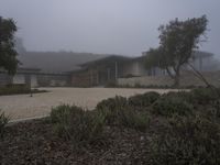 A modern residential home in Los Angeles, California. The house is surrounded by a foggy landscape, with a driveway made of concrete and gravel. The grey sky adds to the gloomy atmosphere.