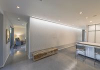 A modern architecture residential property in Los Angeles, California. The interior showcases a spacious living room with floor-to-ceiling windows, allowing natural light to fill the room. The kitchen is designed with sleek furniture, perfect for recreation and entertaining.