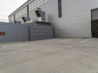 This is an image of a large grey hangar in Los Angeles, California, USA. The hangar is situated in a parking lot, surrounded by modern architectural elements and urban infrastructure. The concrete street leads to the hangar, which features a metal wall with several windows. The image captures the early morning dawn, creating a unique lighting effect on the surface of the hangar and the surrounding area. This photo represents the industrial and modern atmosphere of Los Angeles.