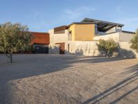 A modern residential house in Los Angeles, California. Surrounded by open spaces and an agricultural landscape. Clear sky above with contrails. The house is situated on a gravel parking lot.