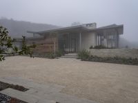 A residential area in Los Angeles, California, showcasing modern architecture. The concrete houses stand amidst fog and a gloomy grey sky. The suburban landscape is surrounded by trees and features a gravel walkway.