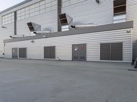 A modern warehouse in Los Angeles, California. The concrete surface and metal walls of the building reflect the early morning light. Adjacent road and loading dock highlight the urban architecture.
