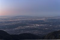 This is an aerial view of the city of Los Angeles, California, USA at dawn. The photograph captures the cityscape with its iconic skyline against a clear sky. In the background, the dark silhouette of the mountains and hills creates a dramatic contrast. The highland terrain and mountain range overlook the city and provide an elevated overview of the open spaces and nature. The atmosphere is serene and peaceful, showcasing the natural beauty of this highland landscape. This image represents the unique combination of urban and natural elements that define Los Angeles.
