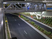 An empty street in Los Angeles illuminated by the lights of the city at night. The road leads to a parking deck surrounded by suburban houses. Artificial light creates a dark and mysterious atmosphere.